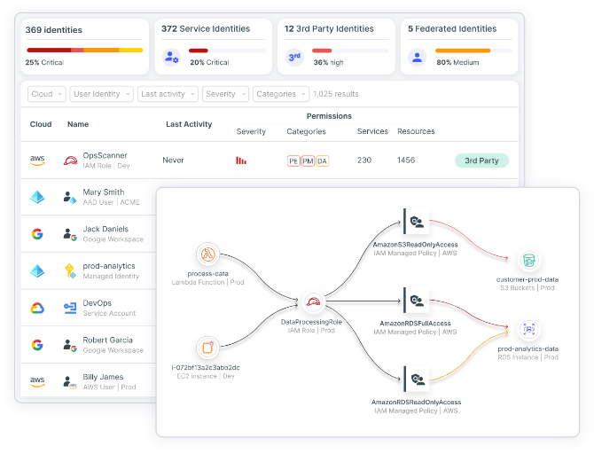 Visualize combinações tóxicas e imponha acesso com privilégios mínimos usando o Gerenciamento de direitos da infraestrutura de nuvem (CIEM). Elimine permissões excessivas e reduza os riscos de movimentação interna e lateral.