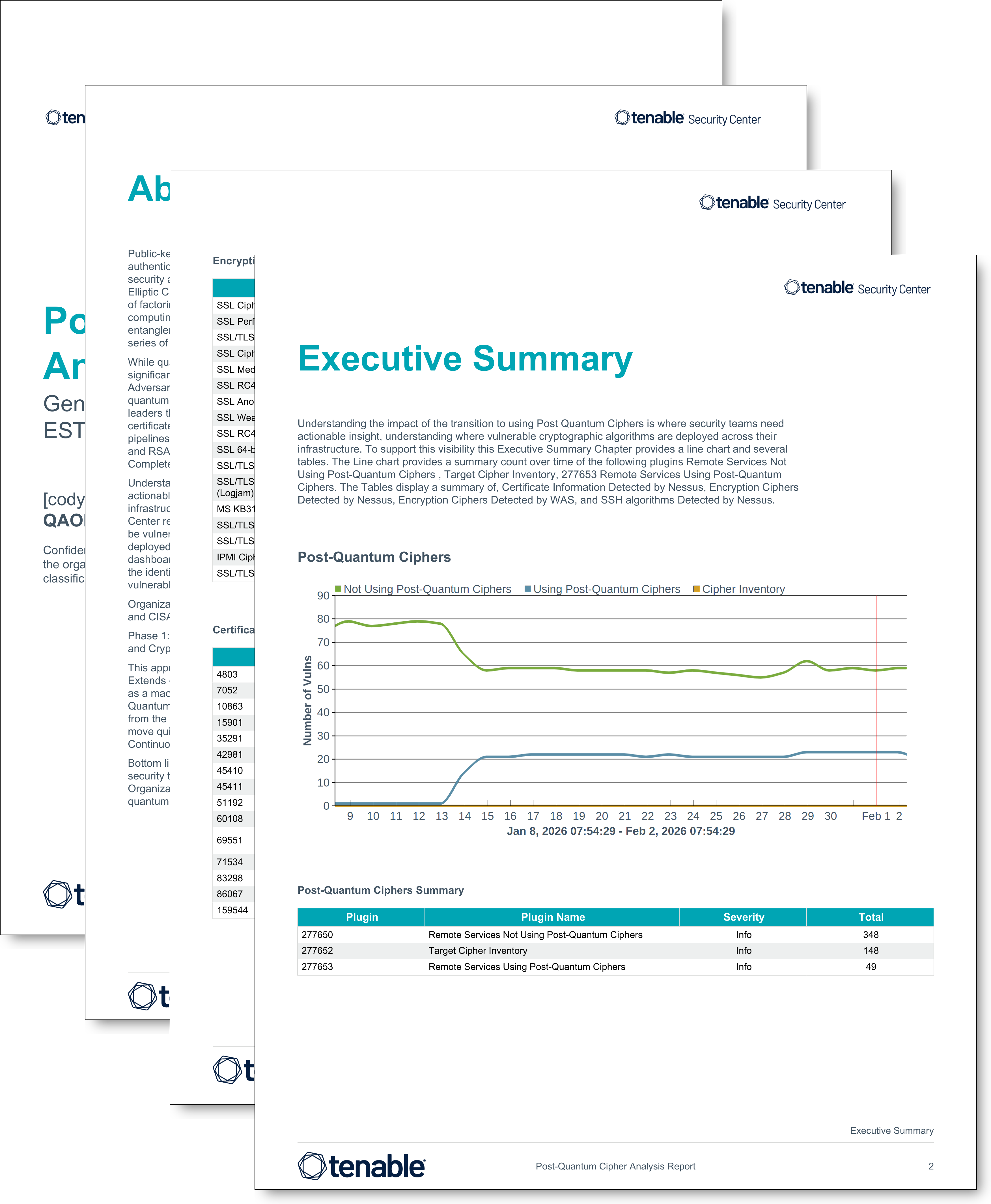 Understanding the impact of the transition to using Post Quantum Ciphers is where security teams need actionable insight, understanding where vulnerable cryptographic algorithms are deployed across their infrastructure. To support this visibility, Tenable provides the Post Quantum Ciphers Dashboard. This Tenable Security Center report is designed to help organizations identify systems relying on cryptographic algorithms that will be vulnerable in a post-quantum world. Key features are the identification where RSA and ECC are currently deployed across your infrastructure, supporting prioritization of modernization efforts. Information within the report assists organizations identify remote services using/not using post-quantum ciphers, including the identification of ciphers in Web Application Scanning (WAS) environments, and identifies potentially vulnerable ciphers, certificates and assets.